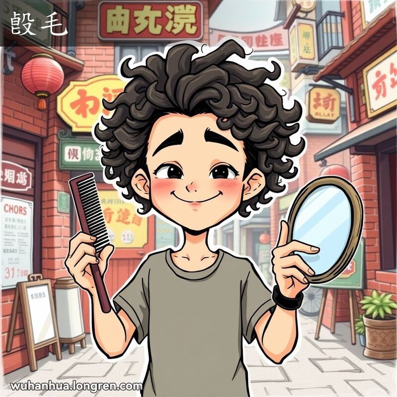 这幅插图描绘了一位武汉年轻人站在传统武汉街景前,头发天生卷曲,手持梳子和镜子,带着顽皮的笑容,戏谑地看着自己的倒影。背景是武汉老街景,有红砖墙、小摊贩与旧式招牌,画面风格为轻松漫画风,色彩鲜艳,极具生活气息,体现了武汉方言“㲃毛”(意为“卷发”)的语义。
