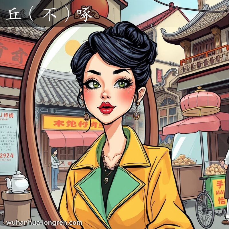 这幅插图描绘了一位武汉年轻女子站在镜子前,欣赏自己精心打扮的妆容和时尚服饰。她浓妆艳抹,唇彩鲜艳,睫毛夸张,衣着花哨。背景是武汉传统街景,有老建筑和街边摊贩,画面风格为夸张的漫画风,色彩鲜艳,带有讽刺意味,体现了武汉方言“丘(不)啄”(意为“打扮得漂亮但实际并不漂亮”)的语义。