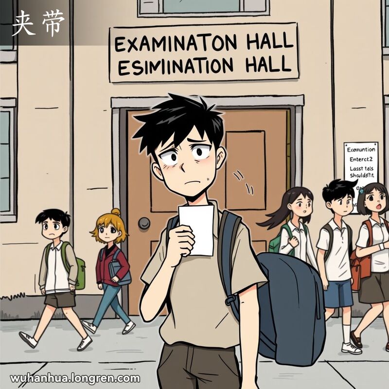 这幅插图描绘了一位学生站在考场外,手中藏着一张小纸条,表情紧张而坚定,体现了武汉方言“夹带”(意为“考试作弊暗中携带的纸条、材料等”)的语义。背景是典型的学校考场,有其他学生进入考场的场景,画面风格为幽默漫画风,色彩较暗,极具紧张感。