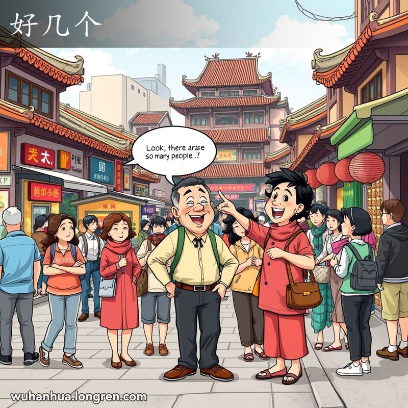 这幅插图描绘了一条热闹的武汉街道,街道两旁是传统建筑和繁忙的市场。一群人站在街道右侧,聊天和欢笑。主角是一位武汉本地居民,他指着这群人,脸上带着惊讶和高兴的表情,仿佛在说:“看,来了好几个人!”背景中有老武汉风格的建筑、五彩的街头小贩和活跃的行人。画面风格为漫画风,色彩鲜艳,充满生活气息,生动地表达了武汉方言“好几个”(意为“不止一个,表示多”)的语义。