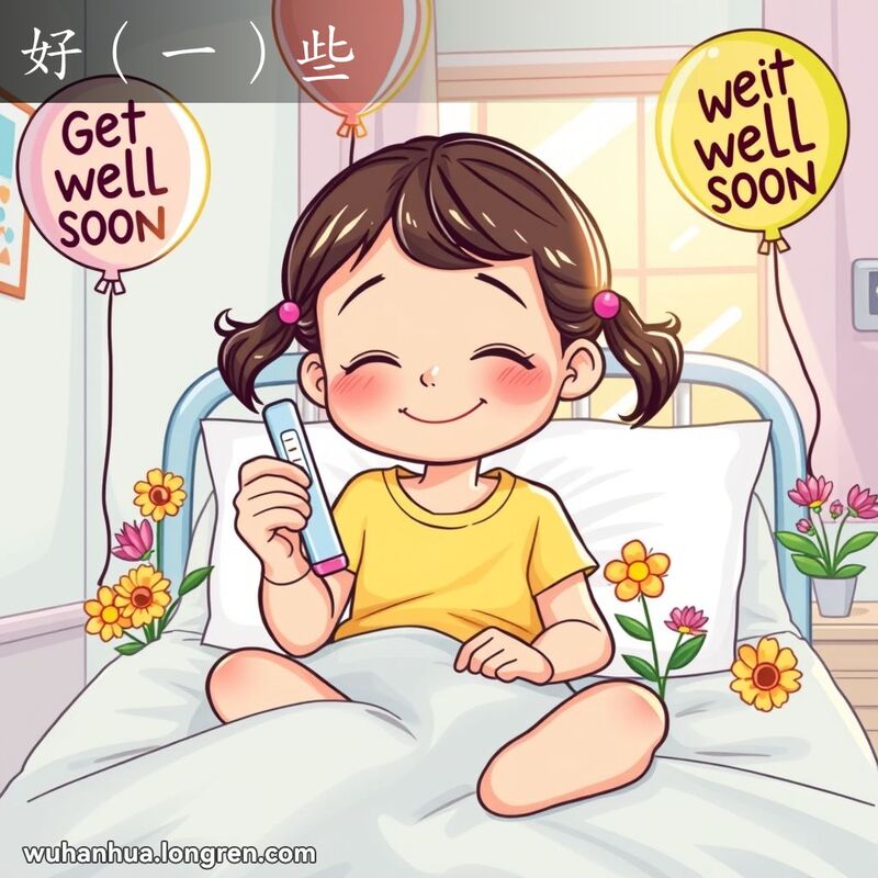 这幅插图描绘了一位坐在医院病床上的女孩,手持体温计,露出柔和的微笑,周围环绕着五彩缤纷的康复气球和鲜花,象征着她的健康状况有所改善。背景是一个温馨的病房,窗外透进温暖的阳光,象征着希望和康复。女孩的表情充满了轻松和愉悦,传达出“好(一)些”的含义。画面风格轻松漫画风,色彩鲜艳,极具生活气息。