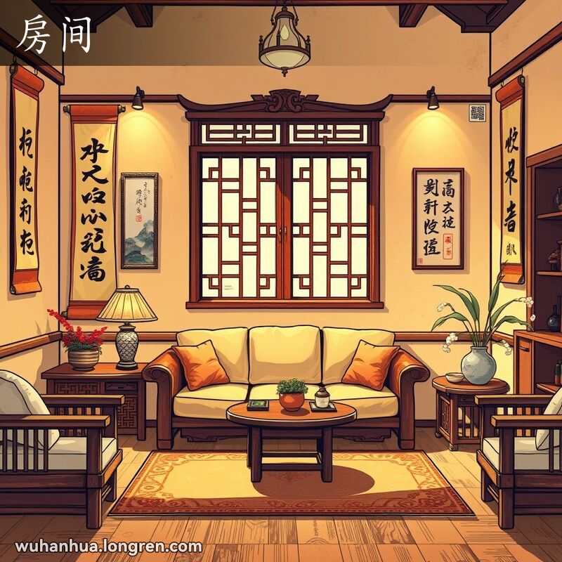 这幅插图描绘了一个温馨的武汉风格客厅,木质家具和装饰品反映了当地文化。房间暖色调灯光照明,中央摆放着舒适的沙发和小茶几。墙上挂着书法和绘画的挂轴,增添了一份优雅。房间有一扇带有传统格子窗花的大窗户,自然光线透过窗户洒入。整体氛围温馨舒适,充满文化气息。画面风格结合了传统中国和现代漫画风格,色彩鲜艳,细节丰富,极具武汉地方文化特色。
