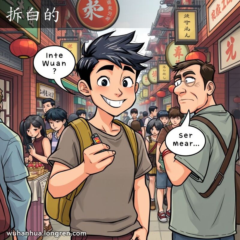 这幅插图描绘了一位武汉年轻人在热闹的市场中,手持一件廉价的小物品,试图以夸张的表情和动作说服旁边的人相信这件物品很有价值。背景是典型的武汉老街景,有红砖墙、旧式招牌和熙熙攘攘的人群,画面风格为幽默漫画风,色彩鲜艳,充满活力和动感,体现了武汉方言“拆白的”(意为“白撮子”)的语义。