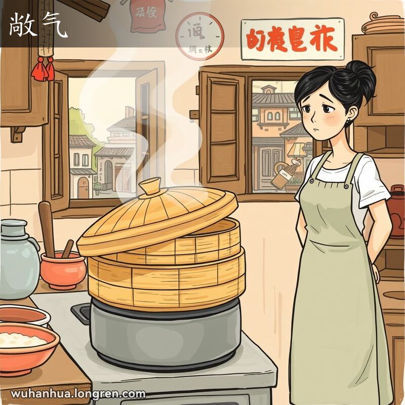 这幅插图描绘了一个传统的武汉厨房场景,竹蒸笼的盖子稍微倾斜,蒸汽正从中飘出。一位穿着围裙的妇女站在旁边,神情略显担忧,似乎注意到蒸汽漏出的情况。背景中有老式木柜、挂历和一扇小窗,窗外是热闹的巷子。画面风格温馨、幽默,色彩柔和,突出了武汉居民的日常生活。
