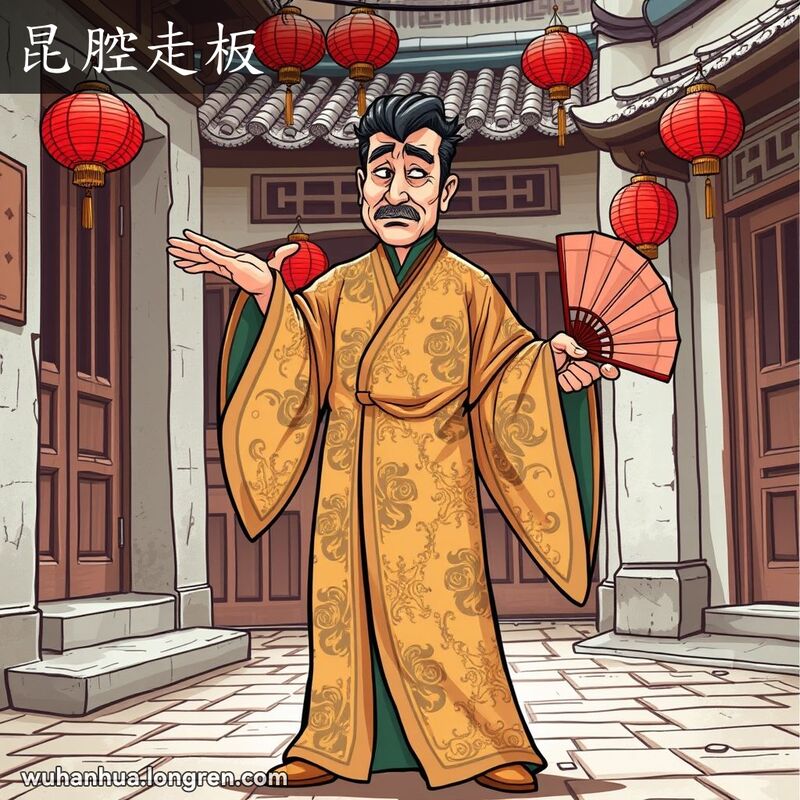 这幅插图描绘了一位身穿戏曲服装的人物,站在武汉老街上,手持折扇,做出夸张的动作和表情,体现了武汉方言“昆腔走板”(意为“拿腔拿调,装腔作势”)的语义。背景是典型的武汉老街景,有木门和红灯笼,画面风格融合了漫画和传统戏曲元素,色彩鲜艳,线条生动,极具戏剧性和夸张感。
