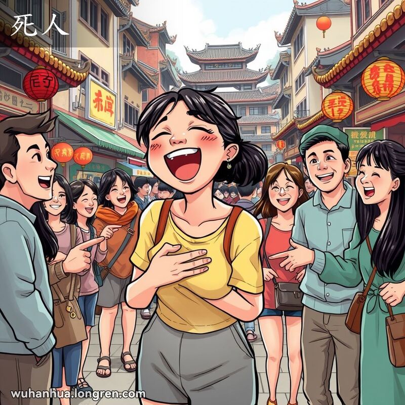 这幅插图描绘了一位年轻女子在武汉的街头笑得前仰后合,捧腹大笑的场景,周围的朋友也在指着什么笑个不停。背景是武汉的老街景,有传统建筑和小摊贩,画面风格为幽默的漫画风,色彩鲜艳,充满活力和生气,体现了武汉方言“死人”(表示感觉的强度)的语义。
