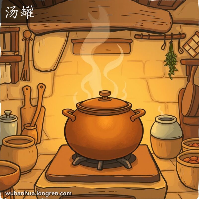 这幅插图描绘了一个温馨的传统武汉厨房,中央是一个老式的炉子,上面放着一个大大的圆形铁锅,锅里冒着热气,显示里面煮着热汤或炖菜。铁锅有一个坚固的把手和一个稍微敞开的盖子,让人可以看到里面冒泡的液体。背景中有木勺、砧板和悬挂的草药等典型的厨房用品,增添了家庭的温馨感。画面风格为手绘的漫画风,色调柔和,充满怀旧的乡土气息。
