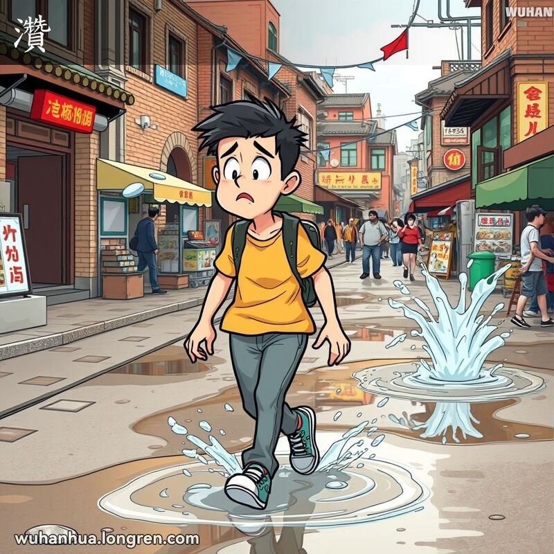 这幅插图描绘了一个人在武汉的街道上行走,不小心踩到水坑,水花四溅,溅到了他的衣服上,表情显得有些惊讶和不悦。背景是武汉的老街景,有传统的红砖墙和小摊贩,画面风格为幽默的漫画风,色彩鲜艳,充满动感。这幅图生动地表达了武汉方言“灒”(意为“溅”)的语义。