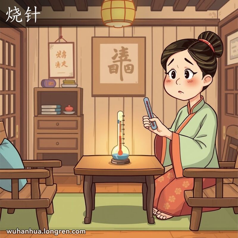 这幅插图描绘了一个传统的武汉家庭场景,房间内有木质家具和一张小桌子,桌子上放着一支老式的水银体温计,也就是武汉方言中的“烧针”。一位母亲正担忧地拿着体温计,表情忧虑。背景是温馨的乡村氛围,暖色调的灯光和简朴的装饰。母亲穿着传统的中国服装,增加了文化气息。画面风格为轻松漫画风,色彩柔和,极具生活气息。