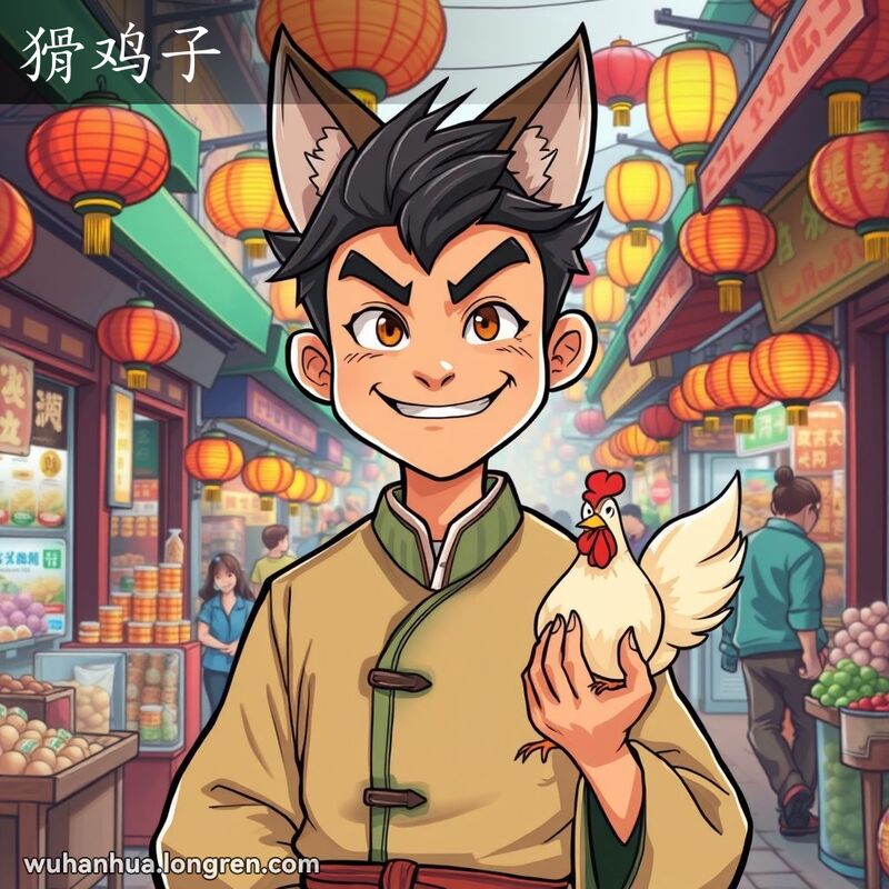 这幅插图描绘了一位穿着传统中国服饰的年轻男子,站在武汉热闹的街市中,脸上带着狡黠的笑容,眼神锐利,嘴角微微上扬,显露出他狡猾的性格。他手中抓着一只小鸡,象征着他的狡诈和机智。背景是繁忙的武汉街市,有色彩鲜艳的摊位、灯笼和忙碌的小贩,画面风格融合了漫画和传统中国元素,色彩明亮,线条动感,充满幽默感和地方特色。