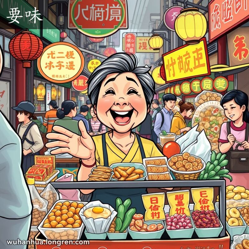 这幅插图描绘了一个热闹的武汉街头市场,摊贩们正在卖力地吆喝,吸引顾客。画面中心是一位中年妇女,她站在一个装满五颜六色小吃的摊位后面,热情地招呼路人。她的摊位上挂满了色彩鲜艳的招牌和横幅,突出她的产品独特的味道和风味。背景中有其他摊贩和顾客,整个画面充满了生机和活力。画风结合了漫画和传统中国元素,色彩鲜明,表情夸张,生动地展现了武汉方言“要味”(意为“卖味”)的语义和当地的文化氛围。