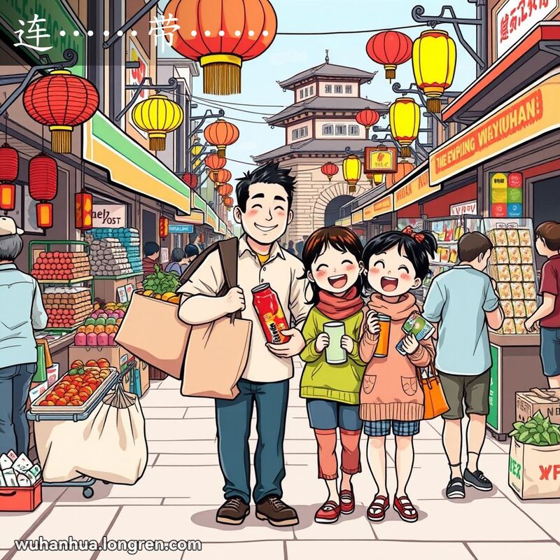 这幅插图描绘了一个热闹的武汉街市场景,一个欢乐的家庭正在一起购物。父亲拎着大袋的杂货,母亲手里拿着各种小吃和饮料,孩子们兴奋地指着不同的商品,表现出他们想要所有东西的渴望。画面中的家庭成员表情夸张,充满了活力和喜悦,背景是色彩斑斓的市场摊位、传统中国灯笼和武汉本地建筑。整体风格为充满活力的漫画风,色彩鲜艳,线条动感,生动地展现了武汉市场的热闹氛围,表达了武汉方言“连……带……”(意为“两项相关的事物一起计算或两种动作同时进行”)的语义。