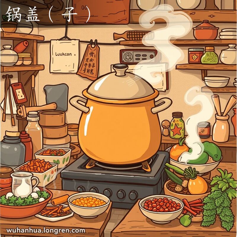 这幅插图描绘了一个传统武汉家庭的温馨厨房场景,主要展示了一个大锅,锅上盖着一个圆形的金属锅盖。锅盖有一个小把手,稍微倾斜,露出锅内冒着热气的食物。背景中有一个木质桌子,桌上散落着各种炊具和食材,营造出一种忙碌的厨房氛围。画面风格温馨、幽默,色彩柔和,极具生活气息,体现了武汉方言“锅盖(子)”的含义。