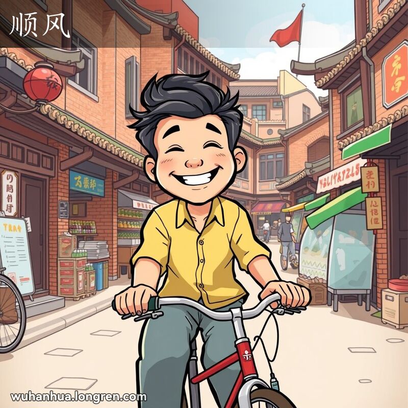这幅插图描绘了一位武汉市民骑着自行车,迎着和风,脸上带着灿烂的笑容,头发和衣服随风飘动,展现了武汉方言“顺风”(意为“方向跟风向相同”)的语义。背景是典型的武汉老街景,有红砖墙、小摊贩与旧式招牌,画面风格为轻松漫画风,色彩明亮,极具生活气息。